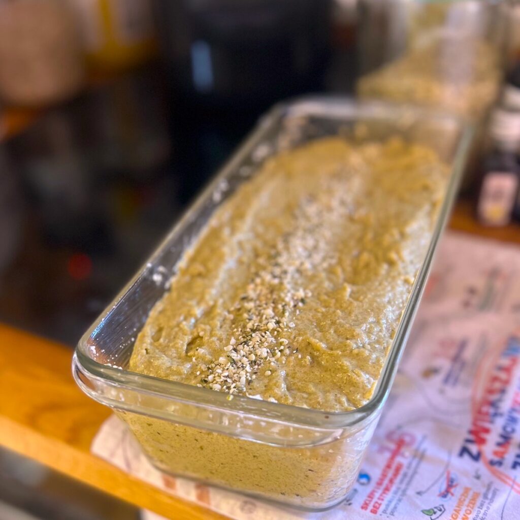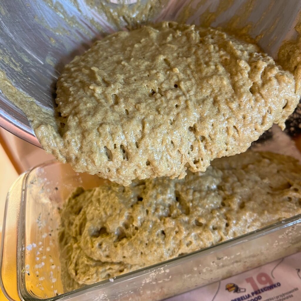 5. Czekam 20 min. aż ciasto stężeje i przekładam je do foremki wysmarowanej tłuszczem i posypanej lekką warstwą łusek konopnych, jak mam – wrzucam kilka ziaren słonecznika na samo dno, aby chleb ładniej odchodził od formy.